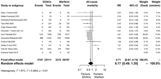 Regarding all-cause mortality, 12 studies with 48,908 participants were analyzed and DOACs were associated with a non-significant 23% reduction compared to warfarin (RR = 0.77, 95% CI [0.49, 1.20], P = 0.247; I2 = 97%, p < 0.001; Figure 2).