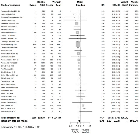 For the primary safety outcome of major bleeding, 34 studies encompassing 434,023 participants were analyzed and DOACs seemed to be associated with significantly less bleeding events compared to warfarin (RR = 0.76, 95% CI [0.63, 0.92], P = 0.004; I2 = 94%, p < 0.001; Figure 3).