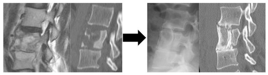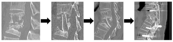 While bone sequestrum is easily visible on CT, it is not possible to distinguish between bone fragments consisting of necrotic bone, residual viable bone, or matrix calcification. MRI may also be able to distinguish between truly avascular ossicles surrounded by necrotic tissue and normal bone with residual vascularity surrounded by vascularized lesion tissue, but it is difficult to accurately determine the extent of the scraping preoperatively at this time [24]. We check the trabecular bone stiffness intraoperatively to avoid increasing the deficit space by excessive curettage, and try to avoid increasing the number of intervertebral spaces required for ASF by removing soft areas and leaving hard areas as much as possible. Although osteosclerotic images often accompany the surrounding decayed bone, removing the osteosclerotic area as much as possible on the cephalocaudal side where the bone graft is implanted is an important condition for bone fusion. It is important to understand the osteosclerotic area by preoperative CT because it may be perceived as normal bone by intraoperative feel and may be left behind.