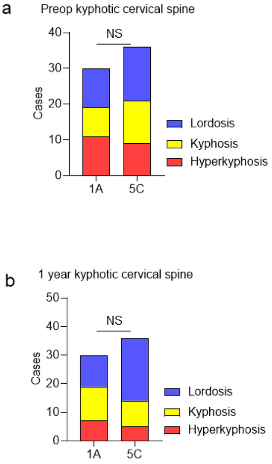 (a) Incidence of preoperative cervical kyphosis between Lenke type 1A and 5C groups. (b) Incidence of cervical kyphosis at 1 year postoperatively between Lenke type 1A and 5C groups. NS, No significant difference.