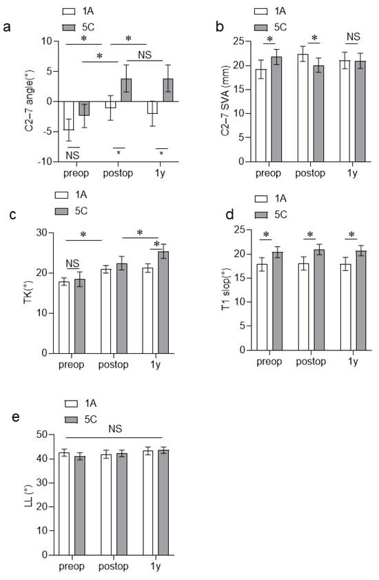 (a–e) Changes in the spinal parameters between the Lenke type 1A and 5C groups before, immediately after, and at 1 year after surgery. NS, No significant difference; * p < 0.05.