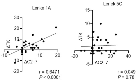 Table 3 and Table 4 show the associations between the C2–C7 angle and other radiographic parameters. In the Lenke type 1A group, the C2–C7 angle was significantly associated with the T1 slope and TK before surgery. In addition, there was a stronger positive association between the C2–C7 angle and T1-slop and TK at 1 year postoperatively (Table 3). However, the other parameters were not associated with the C2–C7 angle. In the Lenke type 5C group, only the T1 slope was significantly associated with the C2–C7 angle before and after surgery. Moreover, there was no significant association between the C2–C7 angle and other parameters including TK (Table 4). Interestingly, the C2–C7 angle changes before and after surgery (ΔC2–ΔC7) were significantly associated with TK changes before and after surgery (ΔTK) in the Lenke type 1A group, but not in the Lenke type 5C group (Figure 4).