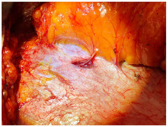 In this technique, sensory nerves are identified traveling with lateral row perforating vessels toward the skin during standard abdominal flap elevation. If the flap is to be based on lateral row vessels, the anterior rectus sheath is incised in line with these perforators, as is commonly performed in DIEP flap harvest. Retrograde dissection of a centrally located sensory nerve is performed until a sensory–motor Y-junction is encountered, typically representing a bifurcation of ICN 11 or 12. The sensory branch is clipped and divided distal to the Y-junction, thus, preserving the motor branch to the rectus abdominis muscle. If the flap is based on medial perforators, a lateral sensory nerve branch is isolated and harvested via a separate 5 mm incision in the fascia (Figure 1), which is closed with a single figure-of-eight stitch [47,53,56]. The rest of flap elevation and pedicle dissection proceed in standard fashion.