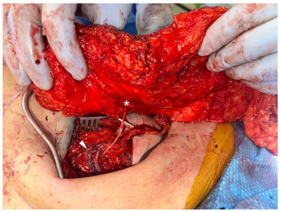 The flap sensory branch (denoted by asterisk) is coapted via bridging nerve allograft to the anterior cutaneous branch of intercostal nerve 3 near the sternum, adjacent to the microvascular anastomoses (denoted by the arrowhead).