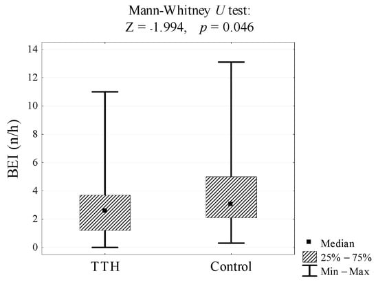 The study involved 108 participants: 34 TTH and 74 control patients. There were 52 females and 56 males. Mean age in TTH was 40.2 ± 12.5 years old and 42.9 ± 12.9 in controls. The mean BMI in the TTH group was 38.9 ± 5.8; in the controls, it was 27.0 ± 5.1. TTH patients had had an average 11 headache days in the previous month (median = 7); therefore, all patients met criteria for episodic TTH. Each patient underwent a brain imaging examination (CT or MRI), which showed no significant abnormalities. The observed mean BEI value was 2.87 ± 2.39 in TTH subjects and 3.96 ± 2.91 in the controls. BEI value was decreased in the TTH group in comparison to the controls (2.6 n/h vs. 3.1 n/h, respectively; p = 0.046, Figure 1). The differences in the frequency of OSA occurrence between TTH group and control were not statistically significant (52.9% vs. 48.6%, p = 0.678), and no significant correlation was observed between the severity of OSA and the presence of TTH (c2 = 0.66, df = 3, p = 0.883). Table 1 presents a precise description of both groups.
