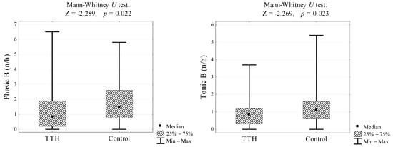 In subjects with tension-type headache, phasic and tonic bruxism episodes were less frequent than in the controls (0.9 n/h vs. 1.5 n/h, p = 0.022 and 0.9 n/h vs. 1.1 n/h, p = 0.023, respectively; Table 3 and Figure 2).