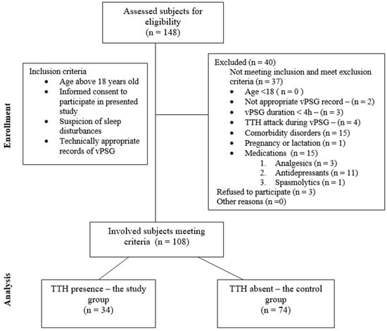 Inclusion criteria in the presented study included participants who had given written informed consent, were adults (above 18 years old), and who underwent single-night vPSG. Exclusion criteria were ages below 18 years, technically not appropriate nocturnal vPSG records, a total sleep time (TST) during examination below 4 h, headache attacks during the vPSG, lack of informed consent, and participants with neurological and psychiatric disorders, autoimmune and systemic diseases, malignancies, pregnancy, or lactation. Subjects using analgesics, antidepressants, and spasmolytics were excluded. The same inclusion and exclusion criteria were used for subjects from the control group. Scheme 1 presents detailed steps of subjects inclusion in this study.