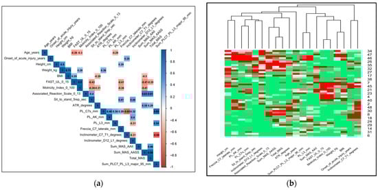 The following descriptive statistics were computed for quantitative variables in the dataset: mean, standard deviation (SD), median, first (Q1) and third (Q3) quartile, and range (minimum–maximum). Spearman correlation coefficients (ρs) between pairs of quantitative variables were visualized by means of a correlation plot since this is an easy and intuitive way to show relationships between the data. This graph shows an upper triangular matrix where blue and red cells correspond to positive (0 ≤ ρs ≤ 1) and negative (−1 ≤ ρs < 0) correlations, respectively. Moreover, the color intensity is proportional to the magnitude of the Spearman indexes (the value of which is reported in each cell). White cells correspond to non-significant correlations (in other words, the correlation test p-values are greater than 0.05). Following the visual mining philosophy, a heatmap was used (Figure 1a,b). This is a graphical representation of the quantitative data collected for the analysis. Starting from the standardized data matrix (each variable has a mean = 0 and variance = 1), this graph inserts statistical units (patients) in rows and variables in columns. Each cell is colored based on the magnitude of the corresponding value (green, white, and red shades correspond to values under, around, and above the mean, respectively). In the graph, similar patients and variables are placed near each other according to the complete agglomerative hierarchical cluster analysis where the distance matrix is obtained by applying the Euclidean measure (Figure 1a,b). To easily identify variables with a similar trend, the graph shows the dendrogram in columns. All the analyses were performed using R version 4.2.1 (packages: arsenal, corrplot, ppcor, gplot, vegan).