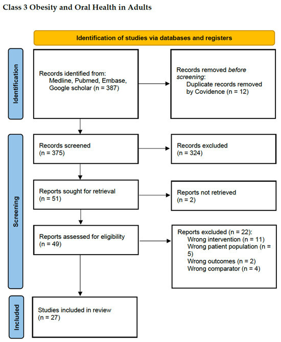 The grey literature was not considered in this scoping review to avoid repetition of findings from previous scoping reviews exploring adult obesity and dental care [15]. No fixed period for publication was set given the minimal available literature. Papers were excluded if they were not written in the English language, they referenced only the paediatric or adolescent population, discussed patients with obesity in general without reference to people with Class 3 obesity specifically, or they included patients with Class 3 obesity planned for, undergoing or post bariatric surgery with no baseline information for dental variables of interest. Bariatric surgery may have complicated associations and typically resulted in weight loss such that study populations would no longer be classified as having Class 3 obesity.