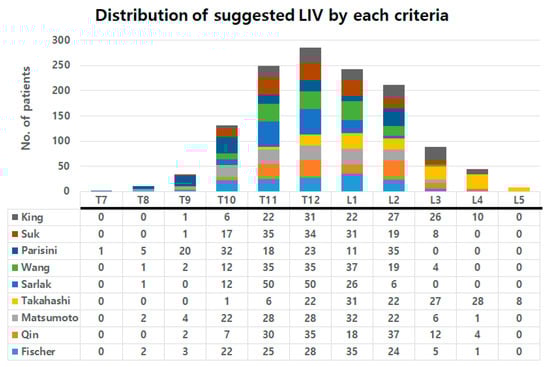 The suggested location of LIV was the most proximal in Parisini’s criteria (mean level of 11.4), while the LIV location suggested by Takashahi was the most distal (mean level of 14.1) (Table 3). The LIVs suggested by the criteria were most frequent in T12, followed by T11 and L1. The detailed distributions of LIV suggested by each criterion are also presented in Figure 2. The actual location of LIV was the mean level of 12.3 ± 1.1; the mean level of EV was 11.7 ± 1.0, NV was 12.3 ± 1.6, and SV was 13.1 ± 1.7 (Table 3). The mean actual LIV level of the current study population was approximately similar to the NV level and was located between the EV and SV levels.