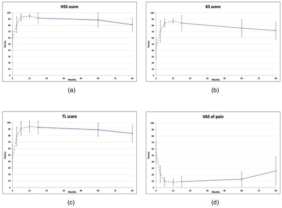 At 60 months after the treatment, all clinical scores for knees were significantly improved compared to baseline levels, but at 84 months, all of them showed a declining trend (repeated measures ANOVA, Figure 1, Table 2). The KS score improved from initial 42.1 ± 15.71 to 75.6 ± 13.88 at 60 months (p < 0.05) and then decreased to 69.7 ± 15.64 (p > 0.05). A similar pattern was observed for the HSS score (baseline 59.0 ± 12.68; 60 months: 88.5 ± 11.25, p < 0.01 and 80 months: 79.8 ± 11.36, p > 0.05) and in the TL score (baseline 46.7 ± 20.5; 60 months: 89.1 ± 9.94, p < 0.01 and 80 months: 81.1± 15.66, p < 0.05) (Figure 1b, c). At 84 months, only the TL score was still statistically significantly improved compared to the baseline value (81.1 ± 15.66, p < 0.05). All measurements are available in Supplementary Material, Table S1.