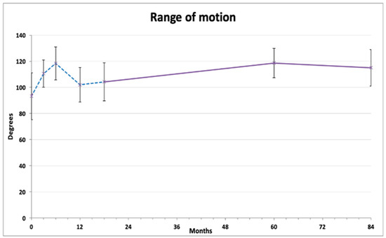 Knee range of motion exhibited a tidal pattern (Figure 2). After initial gradual improvement (at 3 and 6 months), the ROM values decreased 12 months after injection. On further measurements, a steady and lasting improvement was observed compared to baseline, reaching 118.6 ± 11.28 degrees at 60 months and 115.5 ± 13.94 degrees at 84 months (both p < 0.01). Repeated measures ANOVA with Bonferroni post hoc correction revealed that 6 months and 60 months results were significantly better than the baseline average, and that the 12 months and 18 months results were significantly lower than both 6 months and 60 months (Table 2).