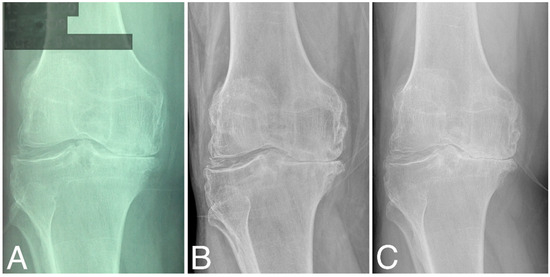 - Keenan, O.J.F.; Holland, G.; Maempel, J.F.; Keating, J.F.; Scott, C.E.H. Correlations between Radiological Classification Systems and Confirmed Cartilage Loss in Severe Knee Osteoarthritis. Bone Jt. J. 2020, 102-B, 301–309. [Google Scholar] [CrossRef]