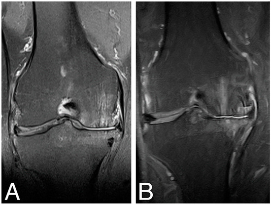 MRI images of the right knee, T2 sequence, and mid-joint frontal plane. (A) baseline (MOCART score 0.4); (B) 84 months time point (MOCART score 0.35).
