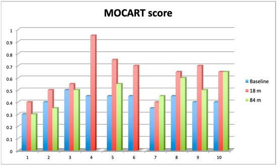 Comparison of 2D Magnetic Resonance Observation of Cartilage Repair Tissue (MOCART) score assessed at baseline (blue bars), after 18 months (red bars) and 84 months (green bars). Value of the score ranges from 0 (complete destruction of articular cartilage) to 1 (intact articular cartilage).