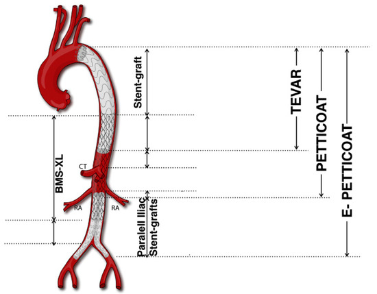 PETTICOAT and e-PETTICOAT technique. CT, Celiac Trunk; RA, Renal Artery; BMS, bare metal stent (Adapted from Kazimierczak et al. [45]).