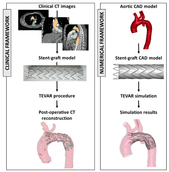 In the recent literature, numerical models have been demonstrated to be a valuable tool for investigating clinical procedures. These models allow researchers to simulate various scenarios, aiding in the understanding of complex interactions between the aortic district and the implanted device [71,72,73]. Figure 2 shows the framework to extract engineering features starting from clinical images and device models.
