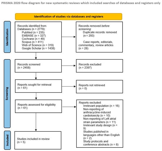 We conducted a comprehensive electronic search across multiple databases, including MEDLINE via PubMed, EMBASE, clinicaltrial.gov, Google Scholar, SCOPUS, and other relevant sources of the literature, from their inception to April 2024, to retrieve studies reporting changes in LAS as an early predictor of AC-induced CTRCD in cancer patients. Predefined Medical Subject Headings (MeSH) terms combined with the Boolean operators ‘AND’ and ‘OR’ were utilized. The search strategy used the following terms: ‘Left atrial strain’, ‘LA strain’, ‘Left atrial longitudinal strain’, ‘Cardiac Toxicity’, ‘chemotherapy-related cardiac dysfunction’, ‘chemotherapy-induced cardiotoxicity’, ‘Anthracyclines’ and ‘ANT’. There were no language or timeframe restrictions during the search. Additionally, we manually searched the reference lists to ensure completeness, and the detailed search strategy can be found in the Supplementary Materials file.