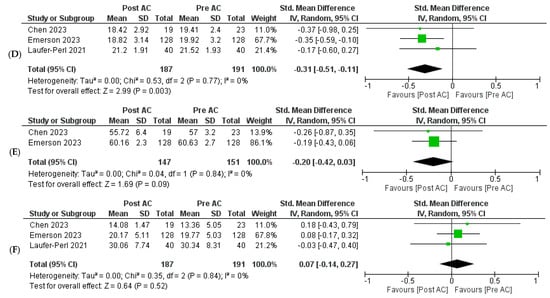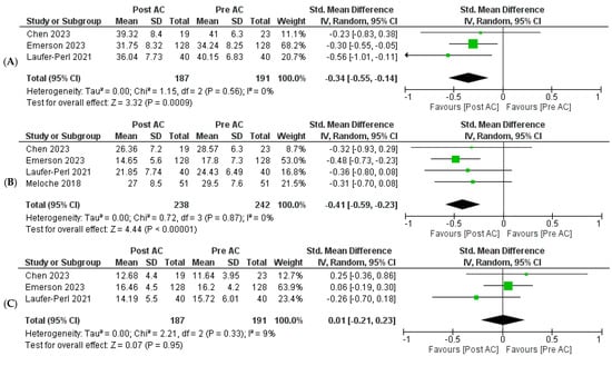 Three of the five included studies provided data on LASr in patients undergoing AC therapy [,,]. Our meta-analysis demonstrated a notable and statistically significant reduction in LASr following AC therapy [SMD = −0.34, 95% CI: −0.55 to −0.14, p = 0.0009]. No heterogeneity was found among the studies (I2 = 0%, p = 0.56) (Figure 2A). Four of the five included studies reported the outcome of LAScd [,,,], and our pooled analysis indicated that AC therapy was associated with a significant reduction in LAScd [SMD = −0.41, 95% CI: −0.59 to −0.23, p < 0.00001]. No heterogeneity was found among the studies (I2 = 0%, p = 0.87) (Figure 2B). Three of the five included studies reported LASct as an outcome [,,]. The meta-analysis indicated no statistically significant change in LASct following AC therapy [SMD = 0.01, 95% CI: −0.21 to 0.23, p = 0.95]. Mild heterogeneity was reported among the studies (I2 = 9%, p = 0.33) (Figure 2C).