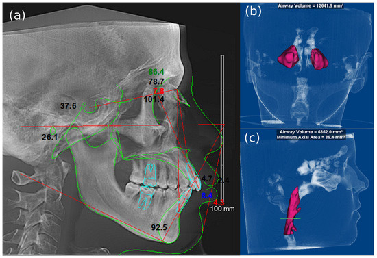 (a) A lateral cephalogram generated through cephalometric analysis, (b) a volumetric analysis of the bilateral maxillary sinuses, resulting in a computed volume of 12,641.9 mm3, and (c) a volumetric analysis of the pharyngeal airway, which revealed a total airway volume of 6862 mm3 and a minimum axial area of 89.4 mm2.
