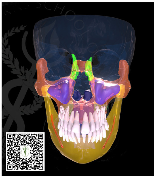 Three-dimensional surface model for visualization. The model presents some radiographic findings such as aplastic frontal and sphenoid sinuses and hypoplastic ethmoid sinuses. By scanning the barcode below using a phone camera, the 3D surface model can be manipulated on the phone screen.