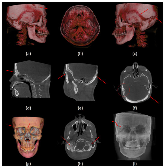 Sutures and other radiographic features. (a) A lateral view of 3D volumetric rendering shows delayed fusion of the coronal suture and Wormian bone at the occipital–mastoid region, (b) top view of 3D volumetric rendering shows copper beaten appearance, (c) a lateral view of 3D volumetric rendering shows delayed fusion of the squamous and lambdoid sutures, (d) a mid-sagittal CBCT slice shows delayed fusion of the frontonasal suture, (e) a sagittal CBCT slice shows delayed fusion of the frontozygomatic and lambdoid sutures, (f) an axial CBCT slice shows wormian bone on the right and delayed fusion of the lambdoid suture on the left, (g) a frontal view of 3D segmentation model shows delayed fusion of the right frontozygomatic suture and the frontonasal suture, (h) an axial CBCT slice shows delayed fusion of the occipitomastoid sutures, and (i) a frontal view of maximum intensity projection (MIP) shows delayed fusion of the right aspect of the lambdoid suture.