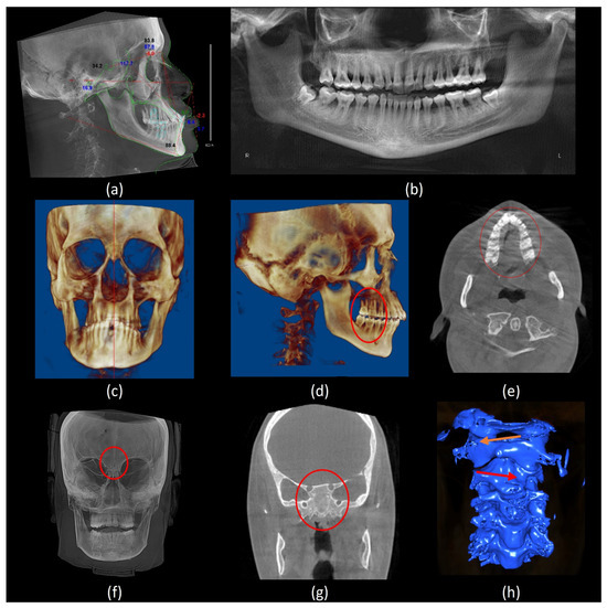 Various radiographic findings. (a) A lateral cephalometric analysis shows hypodivergent face type, hypoplastic maxilla, proclined anterior teeth, and anterior crossbite; (b) a panoramic reconstruction view shows a periodontal bone loss, impacted mandibular third molars and hypoplastic maxillary sinuses; (c) a 3D frontal volumetric rendering view shows facial asymmetry; (d) a 3D lateral volumetric rendering view shows Class II skeletal pattern (prognathic maxilla and orthognathic mandible) Molar class II full step (red circle); (e) an axial CBCT slice shows hypoplastic maxilla (red circle); (f) a frontal view of maximum intensity projection (MIP) shows aplastic frontal sinuses (red circle); (g) a coronal CBCT slice shows aplastic sphenoid sinuses (red circle); and (h) a 3D segmentation model of the cervical spine shows an anticlockwise-rotated C1 vertebra (orange arrow), accompanied by clockwise-rotated C2 and C3 vertebrae (red arrow).