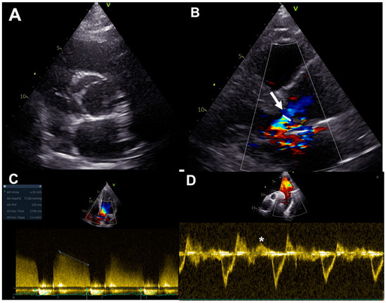 BAV assessment by echocardiography: (A) valve anatomy in parasternal short axis; (B) vena contracta width in parasternal long-axis (arrow); (C) pressure half-time measurement in continuous-wave Doppler; (D) assessment of the diastolic flow reversal velocity in the descending aorta by pulsed-wave Doppler (*).