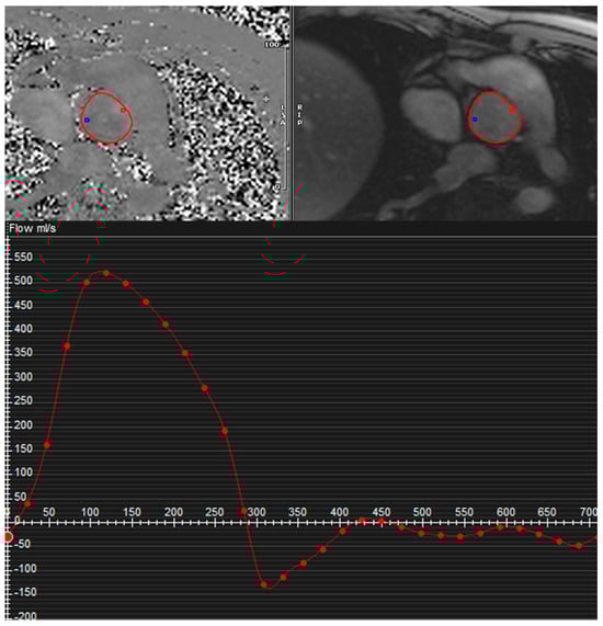 AR quantification by phase-contrast CMR: phase-contrast sequence (above) and aortic flow curve (below).
