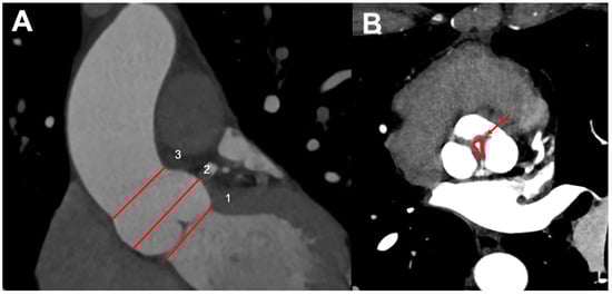 Aortic root dimensions are conventionally measured, from an “optimized” sagittal oblique LVOT reconstruction in the mid-diastolic (prospective ECG gating) or end-diastolic phase (retrospective ECG gating), at three levels: (I) aortic valve annulus (where the valve cusps hinge); (II) midpoint of the sinuses of Valsalva; and (III) sinotubular junction (Figure 4A) [45]. Once the aortic diameters have been evaluated based on gender and body habitus (comparing with the reference ranges [46]), the aortic valve is assessed: number of leaflets (tricuspid, bicuspid, etc.), valvular calcification and free edge thickening [47].