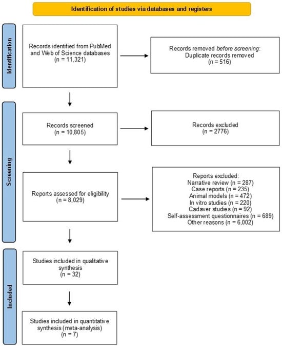 Out of 11,321 papers identified in the database searches, a total of 10,805 non-duplicated articles were screened, and finally, 32 papers met the inclusion criteria for the qualitative analysis (Figure 1). In fact, the primary studies included cross-sectional studies and a single systematic review and meta-analysis. Studies correlating impaired musculoskeletal health with prolonged work activities were described and categorized into four areas: healthcare, farming, industrial, and computer sectors (Table 1). For the purpose of performing quantitative data analysis, the most homogeneous studies were selected, i.e., studies in which the following information was clearly reported: professional activity performed, pathology of interest, the mean age of the study population, and prevalence of the pathology of interest. As a result of this selection, seven studies were eligible for meta-analysis. Specifically, seven studies from the healthcare sector showed eligibility for the meta-analysis of the prevalence of MSDs, including degenerative lumbar spine disease and hand osteoarthritis, among at-risk workers (Figure 1).