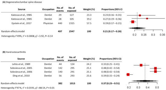 Meta-analysis of the prevalence of work-related Musculoskeletal Disease (MSDs) among at-risk workers in the healthcare sector. (A) Prevalence of degenerative lumbar spine disease [6,16] and (B) prevalence of hand osteoarthritis [13,14,15,17].