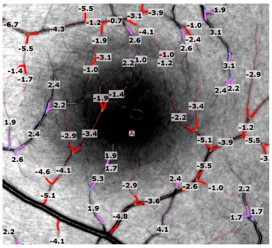 All the subjects underwent RFI imaging in a separate session by a single experienced photographer. Before imaging, their blood pressure was measured. The RFI recorded the heart rate directly by attaching a probe to the subject’s finger, allowing for synchronized image acquisition to the patient’s pulse patterns. After pupillary dilation, five to seven serial RFI images were acquired, centered on the fovea with a field view of 35°. After 15–20 min of imaging, a single observer assessed the quality of the images, low-quality images were not included in this study. Images with visible blood flow in the “ratio mode” were used for analysis; multiple segments, around 12–20 per eye, of secondary and tertiary branches of the main vessels (arteries and veins) were selected. To avoid blood vessel crossings, we choose a blood vessel length of ≤100 µm. Peripheral segments, which were mainly unfocused, were excluded. The built-in software measured each segment’s average velocity and relative standard coefficient of variance, calculated as standard deviation over the mean. A negative value indicates blood flow away from the heart, whereas a positive value suggests blood flow toward the heart (Figure 1). Vessel segments with a relative standard deviation of more than 0.45 were automatically highlighted, and consecutively deleted, by the built-in software as they were considered unreliable.