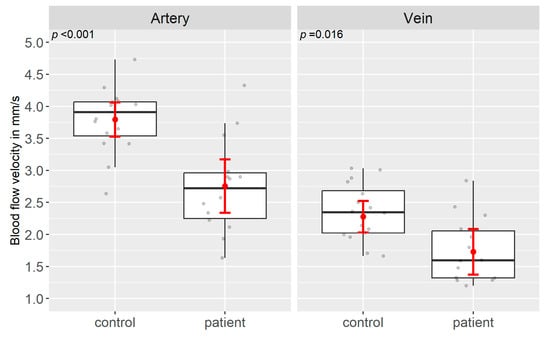 The mean BFV in patients in both the arteriolar (2.75 ± 0.74 mm/s), and venular segments (1.75 ± 0.51 mm/s) were significantly lower compared to controls (arteriolar: 3.79 ± 0.50 mm/s, p < 0.001; venular: 2.35 ± 0.44 mm/s, p = 0.016) (Table 2, Figure 3).