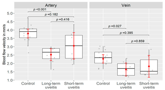 When analyzing the individual segment velocities, a logarithmic transformation to transform the velocity data into a normal distribution was used. Given the hierarchical data structure (eyes nested within patients), a mixed regression model with a random patient effect and maximum likelihood estimation method was fitted separately for the arteries and veins from the retina [52]. In this way, standard errors could be adjusted and eventual correlation within the patients could be modeled. The differences between the marginal means were then tested using a covariance structure from the model above and degrees of freedom adjusted with the containment method [53]. The t-statistic was used to derive p values, which were then adjusted with Tukey’s method for multiple comparisons, when we compared three groups (long-term, short-term and control) against each other. All analyses were performed using R Core Team 2021 [54]. The significance was set at p < 0.05.