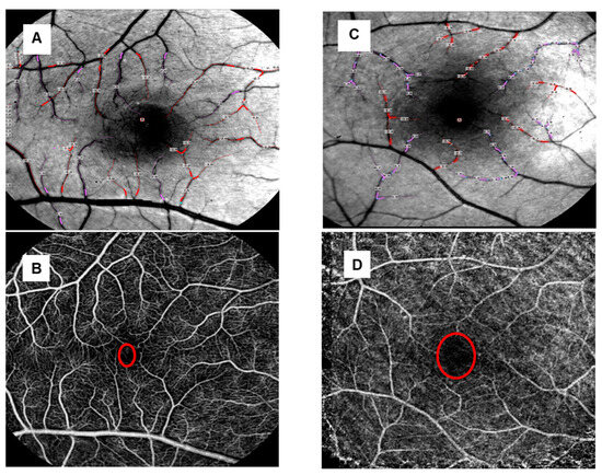This ischemic effect on the retinal vasculature could also be qualitatively visualized with the RFI when using non-invasive capillary perfusion maps (nCPMs), as already shown with the nCPMs in different stages of diabetic retinopathy [8,9,30,33,35]. The nCPMs in our retinal vasculitis patients revealed a reduced number of retinal arterioles and venules, a lower degree of vessel complexity and branching patterns, as well as an enlarged foveolar avascular zone (Figure 4B,D). In particular, retinal vessel reduction and capillary non-perfusion were even more pronounced in patients with a prolonged inflammatory retinal disease (Figure 4A–D). These alterations are in line with previous data based on FAG and OCT-A [5,6,7,11,13], indicating once again the occlusive effects of retinal vasculitis.