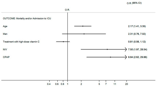 As illustrated in Figure 1, the high-dose vitamin C treatment did not result in a statistically significant decrease in mortality and admission to the intensive care unit, even if the result bordered on statistical significance. On the contrary, age was independently associated with in-hospital mortality and admission to the intensive care unit, as well as N.I.V. and CPAP (OR 2.17, 95% CI 1.41–3.35; OR 7.50, 95% CI 1.97–28.54; OR 8.84, 95% CI 2.62–29.88, respectively). When we consider the length of hospital stay (Table 4), treatment with high-dose vitamin C represents a predictor of shorter length of hospitalization. Although length of hospital stay was not statistically significantly different between the two groups, a statistically significant difference was found when correcting the confounding variables. This difference was not only statistically significant but also clinically relevant. The data mentioned above allowed us to demonstrate an excellent safety profile of vitamin C in the short term.