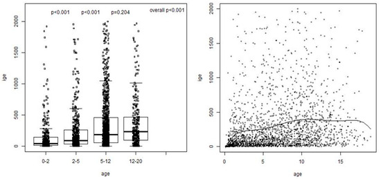 - Sacco, C.; Perna, S.; Vicari, D.; Alfò, M.; Bauer, C.-P.; Hoffman, U.; Forster, J.; Zepp, F.; Schuster, A.; Wahn, U.; et al. Growth Curves of “Normal” Serum Total IgE Levels throughout Childhood: A Quantile Analysis in a Birth Cohort. Pediatr. Allergy Immunol. 2017, 28, 525–534. [Google Scholar] [CrossRef] [PubMed]