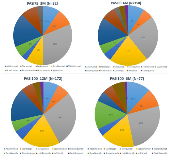 More than half of patients (65.83%) met their target goals at the 6-month hallmark, while at the 12-month evaluation, 71.66% of them obtained complete clearance of their lesions. Additionally, 32.08% of patients were super-responders, having obtained PASI100 at the 6-month hallmark. Most patients who met target goals underwent treatment with ixekizumab (10, 20, and 48, respectively). Risankizumab and secukinumab closely followed. However, as seen in