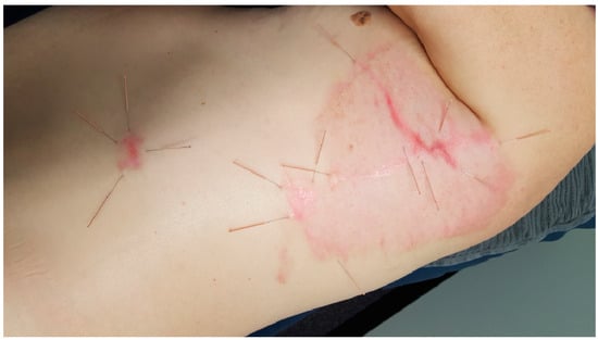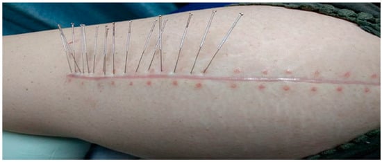Acupuncture is a treatment system rooted in the traditional Chinese medicine (TCM) paradigm. On the basis of the stimulation of specific points on the body, it employs thin metal needles or pressure to activate these points, which are located along 12 bilateral meridians [8]. Manual acupuncture involves various needle movements, such as lifting, thrusting, and rotating. The potential pain relief mechanism arises through the impact on the limbic system and the activation of afferent fibers. This stimulates the spinal cord, leading to the synthesis of dynorphin, enkephalin, serotonin, and norepinephrine. This process inhibits the transmission of pain in both pre- and postsynaptic pathways in the spinal–thalamic tract [9]. Acupuncture is a safe treatment method, but it may have side effects such as bruising and minimal bleeding. Figure 1 depicts an example of acupuncture’s application in scar treatment.
