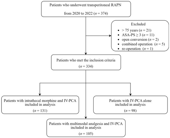 From 2020 to 2022, 492 patients underwent RAPN at the Department of Urology at our institute. Among them, 374 underwent transperitoneal RAPN. Out of this cohort, the following 40 patients met the exclusion criteria of our study: 21 patients aged over 75 years old, 11 patients with ASA-PS ≥ 3, 2 patients with open conversion, 5 patients with combined operation, and 1 patient with re-operation until POD 1. Therefore, 334 patients were included in the final analysis. Among the patients, 131 and 105 received intrathecal and multimodal analgesia, respectively, according to the RAPN analgesic protocol at the time of surgery. The remaining 98 patients who underwent transperitoneal RAPN in 2020 before the commencement of intrathecal or multimodal analgesia were allocated to the IV-PCA group. Figure 2 shows a flowchart of the study cohort.