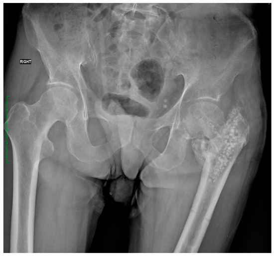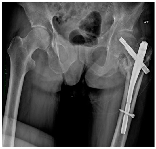 In July 2022, the patient came to the emergency room due to severe pain in the left hemiparetic limb and the inability to bear weight on it after a fall from his own height. During the examination, an X-ray revealed a pertrochanteric fracture of the left lower limb. The second day after the fracture, surgery was performed to stabilize the fracture with a Gamma nail. Figure 1 shows the X-ray taken after the initial surgery, illustrating the successful fusion of the fracture.