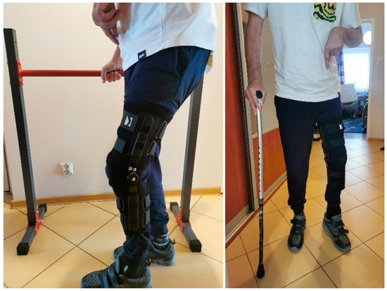 Following the surgery, the patient underwent a 6-week intensive rehabilitation program to enhance his general fitness and relearn walking using orthopedic equipment. The patient was discharged from the hospital in good general condition, walking with support for short distances using handrails and a brace limiting the flexion of the left knee joint. Table 3 shows the detailed rehabilitation program for each stage of treatment.