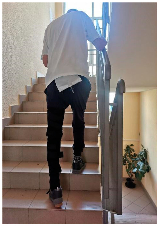 Patient after surgery, walking up the stairs with the help of orthopedic equipment.
