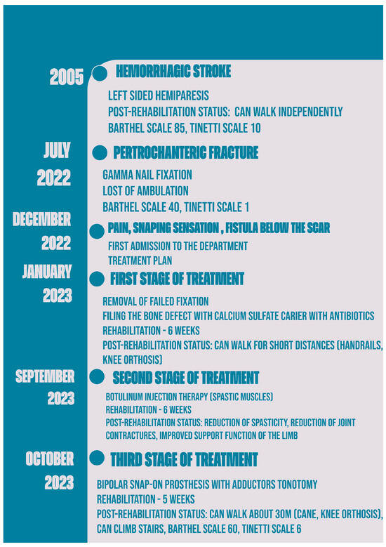 After the final stage of the treatment, which involved the insertion of a complete bipolar snap-on prosthesis and adductor muscle tenotomy, the patient was able to walk short distances (about 30 m) and climb the stairs with support (Figure 4 and Figure 5). His Barthel scale score improved to 60, although his Tinetti scale score remained low at 6, indicating ongoing balance and mobility challenges. The patient was discharged home after five weeks of rehabilitation with recommendations to continue the exercises at home (balance and mobility training to decrease the risk of further falls) and to continue the botulinum therapy every 3 months. Figure 6 displays a detailed timeline of the patient’s treatment.