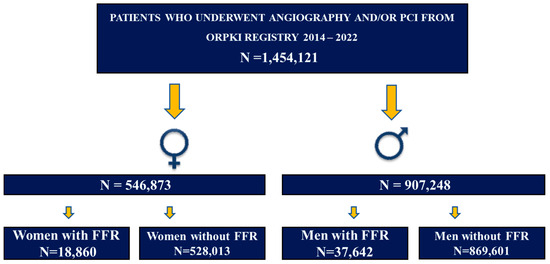 The current multicenter, retrospective analysis was performed using the data from the national registry of percutaneous coronary interventions (ORPKI), which is a prospective registry conducted by the Jagiellonian University Medical College in Krakow in collaboration with the Association of Cardiovascular Interventions of the Polish Cardiac Society. Although participation in the ORPKI database is optional, nearly all catheterization laboratories in Poland (98%) submit their data. The detailed description of the registry was presented in previous papers [9,10,11]. Currently, there are more than 160 catheterization laboratories in Poland that are reporting data for the ORPKI registry online. For this analysis, data on all percutaneous procedures (angiography or PCI) were extracted for an 8-year period. The study cohort comprised all adults undergoing angiography and/or PCI between 2014 and 2022 derived from the ORPKI registry and divided into groups with FFR-guided and angio-guided procedure and stratified by sex. We have retrospectively analyzed the data of more than 1.4 million angiography and/or PCI procedures [1,454,121 patients (62.54% men and 37.46% women)]. We evaluated the baseline characteristics, procedural outcomes, and the prevalence of peri-procedural complications. Baseline characteristics and outcomes were reported for patients with and without FFR-guided procedures (coronary angiography (CAG) and CAG followed by PCI). Only peri-procedural outcomes and complications were recorded in the database. The utilization of FFR, as well as all the technical aspects of the procedure, e.g., vascular access and treatment strategy, were left to the discretion of the operator. Pharmacological therapy during and after the procedure was prescribed at operator’s discretion. The Bioethics Committee’s approval was not required because of the retrospective nature of the study and anonymization of the collected data. The study flowchart is presented in Figure 1.