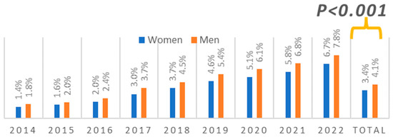 The FFR-guided procedure was performed in 61,305 (4.22%) patients and more frequently in men than women (4.15% vs. 3.45%, respectively, p < 0.001). FFR was less often performed in acute coronary syndrome (ASC) than in chronic coronary syndrome (CCS) (24.85% vs. 75.15%, p < 0.001). Differences in the number of FFR-guided procedures between men and women in the years 2014–2022 have been illustrated in Figure 2.