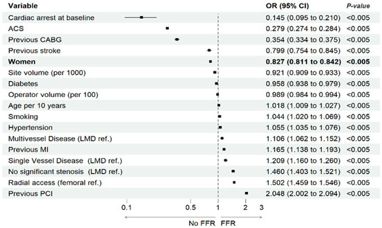 In the multivariable analysis, adjusted for baseline, clinical, procedural, and angiographic characteristics, as well as operator/site volume, female sex was associated with a lower probability of performing FFR (odds ratio of 0.827; 95% confidence interval 0.811–0.842, p < 0.001). Other independent factors associated with FFR utilization have been shown in Figure 3.