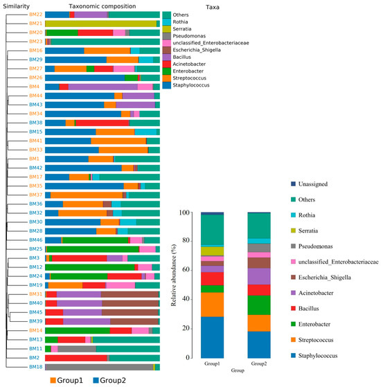 Overall, 1286 genera were detected among the breast milk samples in this study. Correlation network analysis illustrated a genus-level network map for all samples, as depicted in Figure 2. Spearman rank correlation analysis was conducted based on the abundance of each species and genus in the samples. The bacterial abundance traits were assessed across the entire threshold range (0 to 1, in increments of 0.01), generating predictions for each sample. Predicted phenotypic types included Gram-positive, Gram-negative, biofilm-forming pathogenic, mobile element-containing, oxygen-utilizing, and oxidative stress-tolerant. The data revealed that most of the relatively abundant bacteria in the breast milk samples comprised five genera: Staphylococcus, Streptococcus, Rothia, Corynebacterium, and Haemophilus. Gram-positive bacteria, specifically Staphylococcus and Streptococcus, displayed a significantly higher abundance in Group 1 (presence of MPs), while Group 2 (absence of MPs) exhibited elevated proportions of Enterobacter, Escherichia, Pseudomonas, and Acinetobacter (Figure 3).