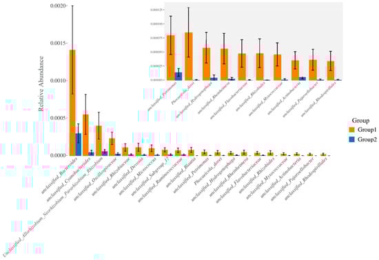 The taxonomic distribution of bacterial communities in breast milk revealed genus-level differences between the group with detected MPs (Group 1) and the group without detected MPs (Group 2). Pairwise comparisons using Wilcoxon test (p < 0.05).